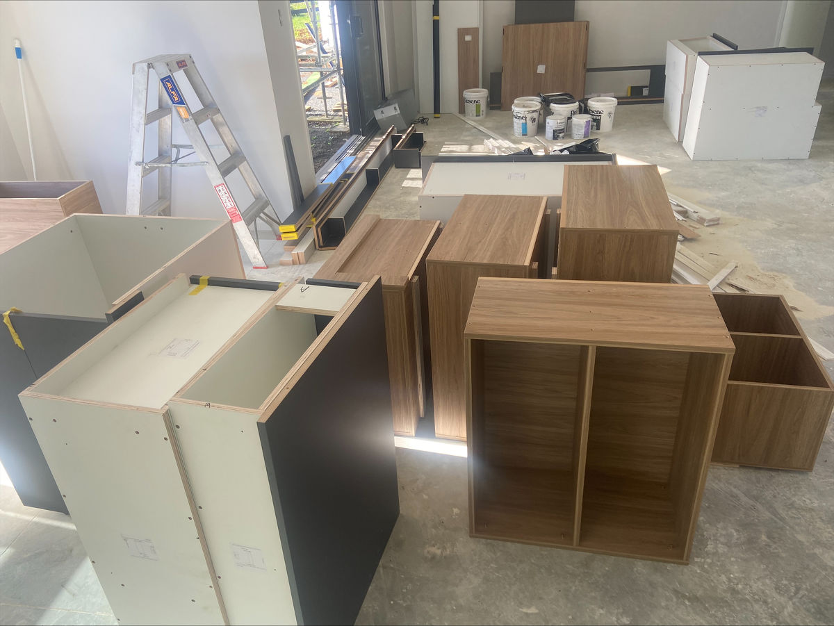 Once your kitchen arrives on site, your installer will fit the new cabinetry and any laminate benchtops. For stone tops and any splashbacks we provide, the install includes a temporary template that stays in place until we fit them approximately two to three weeks after the cabinetry. (Final payment for stone tops will be due after this install)